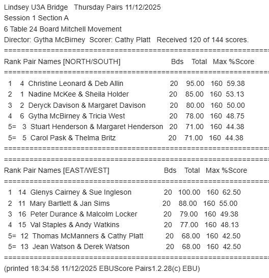The Lindsey U3A Bridge Group is open for face-to-face Bridge
